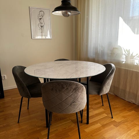 Matgrupp från Mio. Vitt marmormönstrat glas med underrede i svartlackerad metall och 4 stolar.