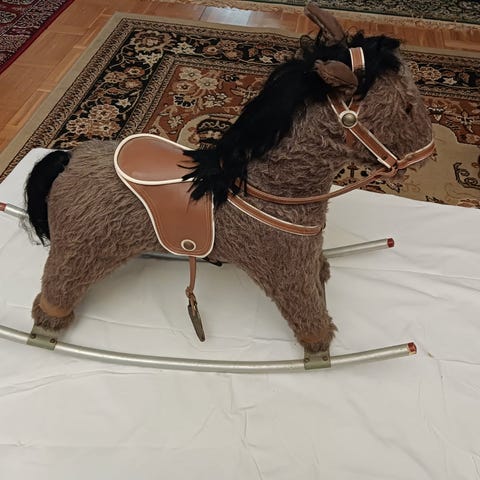 Röd gunghäst i trä för barn. Klassisk modell med sits, handtag i trä och medar för gungning. Passar som leksak inomhus och som inredningsdetalj i barnrum.