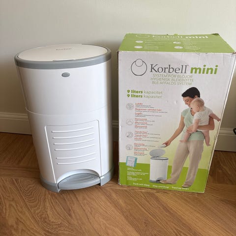 Blöjhink i vit plast med grå detaljer. Pedalöppning framtill och lock upptill. Passar för förvaring av använda blöjor i barnrum eller badrum. Står stadigt på golvet och är utformad för att hålla innehållet avskilt och dolt.