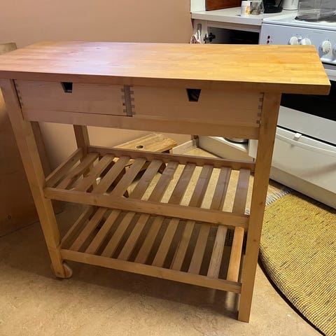 Säljer ett IKEA BEKVÄM rullbord i massiv björk. Stabil och rejäl konstruktion med två hyllplan och arbetsyta upptill. Försett med hjul vilket gör det lätt att flytta runt – perfekt som köksvagn, extra arbetsyta, serveringsbord eller förvaring.