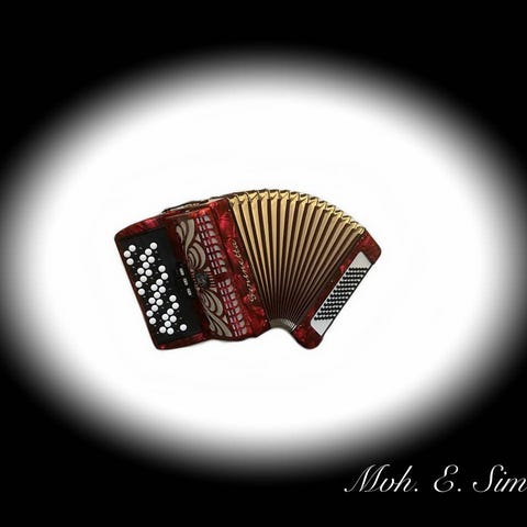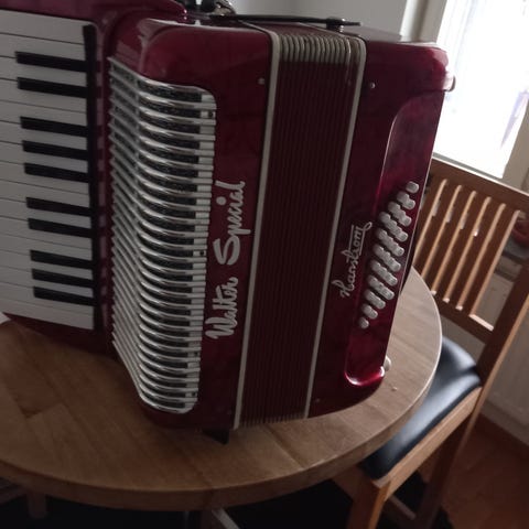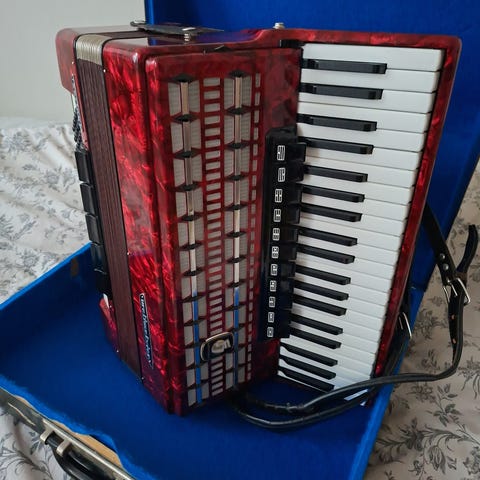 Ett Pianodragspel av märket Hohner. Mellanstort med 37 tangenter och 96 bas. 3 register i diskanten. 2-körigt med klarinettstämmor som påminner lite om musette. Nyservat med bl.a: