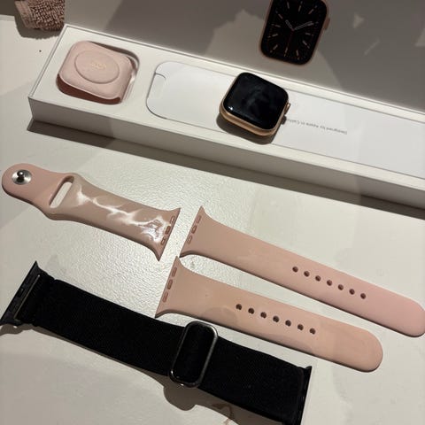 Apple Watch serie 4, 40 mm, med ett extra rosa band i silikon. Klockan levereras med laddkabel och originalförpackning. Klockan är varsamt skött.