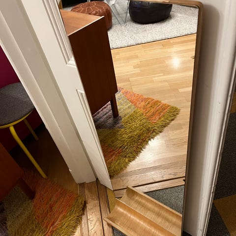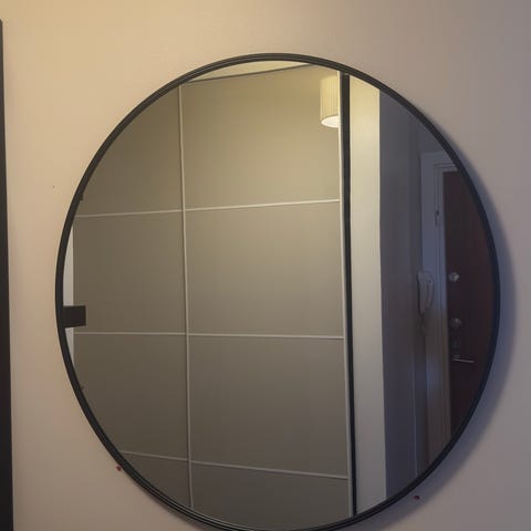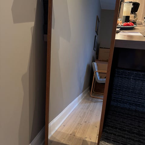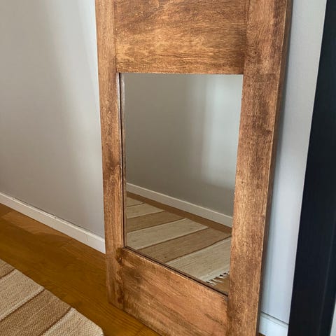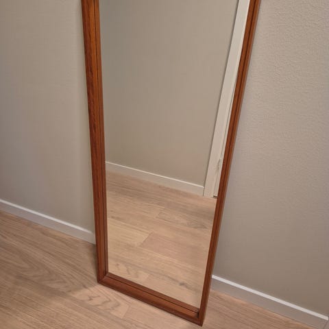 Spegel med ram i mörkt färgat trä. Går att hänga på väggen. Ramen har några små skavanker, håller ihop men kanske skulle behöva någon förstärkningsspik. Spegeln bra skick.