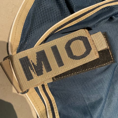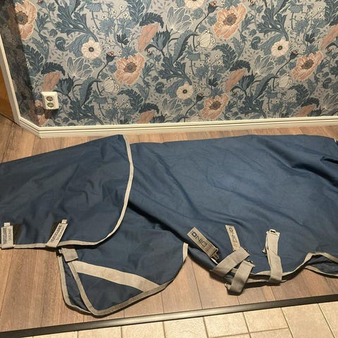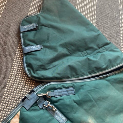 Stl 130/6.0, tjockt utetäcke med löstagbar hals. Lagning vid bogspänne, se bild. I övrigt helt och håller tätt. Lite solblekt.