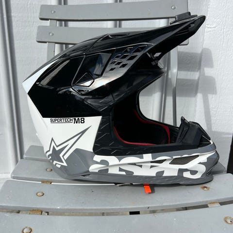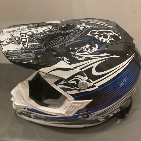 Crosshjälm i vitt och svart med mönstrad grafik. Passar för exempelvis motocross, enduro eller annan offroad körning.