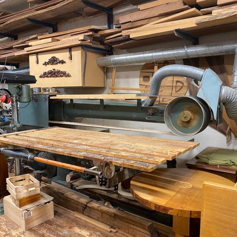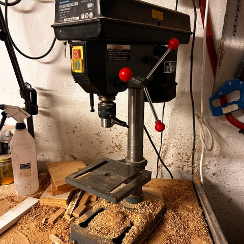 Gamla träbearbetningsmaskiner bestående av flera enheter för verkstad eller snickeri. Utrustningen omfattar en större pelarborrmaskin i gjutjärn med rund borrplatta, remdrift och manuell matning, en stående bandsåg i träkonstruktion med övre och nedre hjul samt arbetsbord, en lång bordssåg/bänksåg i trä med inbyggd elmotor och sågklinga i mitten av bordet samt en manuell träpress med gängad spindel och pressplatta. Maskinerna är av äldre modell och är huvudsakligen uppbyggda i trä och metall. Lämpliga för den som söker äldre verkstadsutrustning för renovering, reservdelar eller dekorativt bruk i snickerimiljö eller utställning.