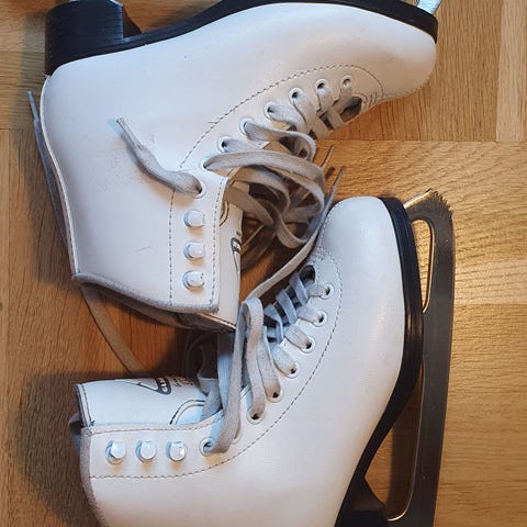 Spin skridskor för barn i storlek 33. Modellen är vit med snörning framtill och fodrad insida. Skridskorna har tåhake framtill på skenan och klack baktill. Passar för allmän åkning på is, exempelvis i ishall eller på utomhusis.