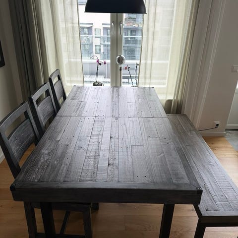 Bordet och stolar är ifrån serien woodenforge på mio och bordet har rustikt utseende i en grå nyans. Bordet har en lite spricka (se bild) lite repor men inget man tänker på alls. I övrigt fint skick.