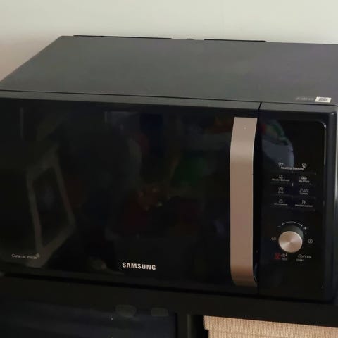 Samsung mikrovågsugn i svart utförande. Framsidan har digital panel med flera förinställda program, bland annat Auto Cook, Quick Defrost, Soften/Melt, Deodorization samt klockfunktion. Ugnslucka med handtag på sidan. Fristående modell som placeras på bänk. Passar för uppvärmning, upptining och enklare matlagning i kök eller pentry.