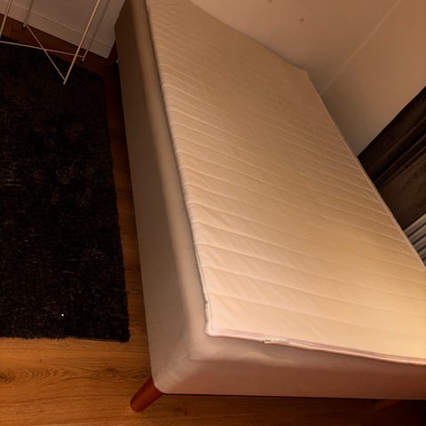 Vit fin sängstomme från Ikea i bra skick. Mått: Bredd: 180cm, Höjd gavel: 115cm, Höjd fotända: 48cm och Längd: 210cm