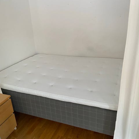 IKEA säng med vadderad huvudgavel . Sängen har en övermadrass i vitt tyg och står på ben i metall. Passar som enkelsäng i sovrum eller gästrum. Tygklädd stomme och gavel ger ett enhetligt uttryck och neutral grå färg gör den lätt att kombinera med annan inredning.