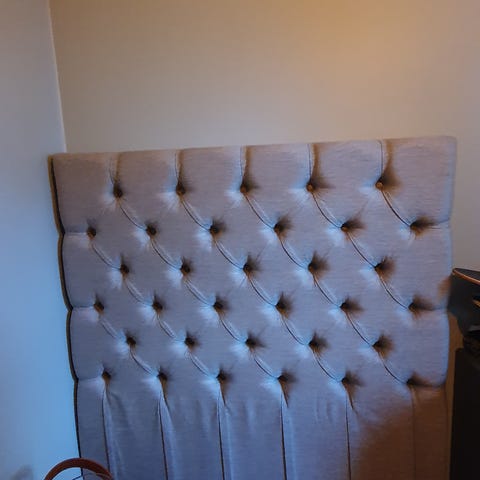 Sänggavel i textil i mörkgrå färg med nedre parti i mörkare ton. Rektangulär modell som placeras bakom sängen för att ge stöd och skydda väggen. Passar sovrum med neutral och enkel inredningsstil. Fler bilder kan skickas vid begäran