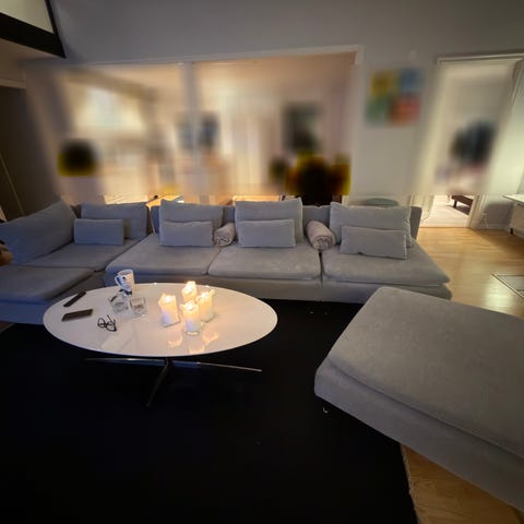IKEA hörnsoffa med schäslong i grå textilklädsel. Soffan är moduluppbyggd med flera sittplatser och en förvaringsdel under schäslongen. Ryggkuddar och sittdynor är lösa och avtagbara. Enligt måttuppgifterna är soffan cirka 333 cm bred åt vänster sida och 252 cm åt höger sida, med en total höjd på cirka 104 cm inklusive ryggkuddar. Sitsdjupet är cirka 60 cm och sitthöjden cirka 49 cm. Passar som större vardagsrumssoffa med gott om sittutrymme och extra förvaring. Design av Alfred Homann.