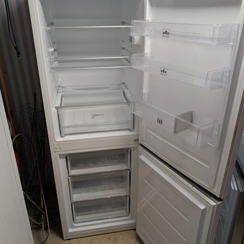 Kombinerad kyl- och frysdel med separata dörrar. Kylskåpet har hyllor i glas, grönsakslådor och flaskhylla samt dörrhyllor för förvaring. Frysdelen har utdragslådor för överskådlig förvaring av frysta varor. Passar för användning i kök eller förråd där ett fristående kylskåp behövs.