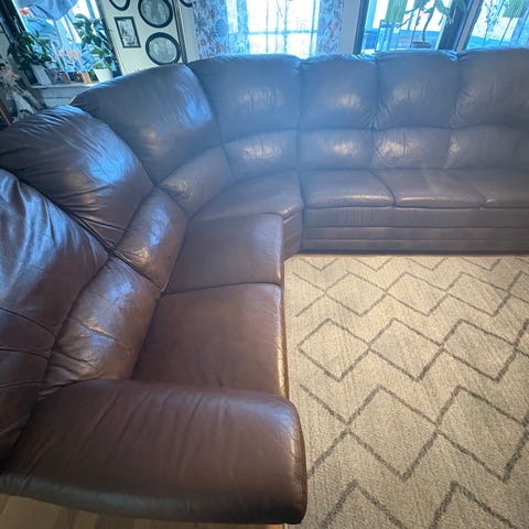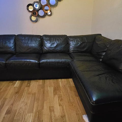 Säljer vår 7-sitsig skinn hörnsoffa från Hjort Knutsson som är 340x230cm bred, 91cm djup och 97cm hög. Soffan är i bra skick och säljs pga. flytt.