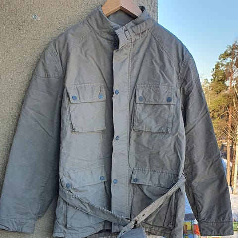 True Religion jacka för herr i storlek XL. Jackan är grå och tillverkad i polyester. Modellen har dragkedja framtill, resår vid midja och ärmslut samt flera fickor, bland annat ärmficka med dragkedja. Utsidan har olika broderade märken och patchar. Insidan har ett avtagbart, quiltat orange foder i västmodell som fästs med knappar. Jackan passar som ytterplagg i vardagen och kan användas med eller utan det innersta fodret beroende på temperatur.