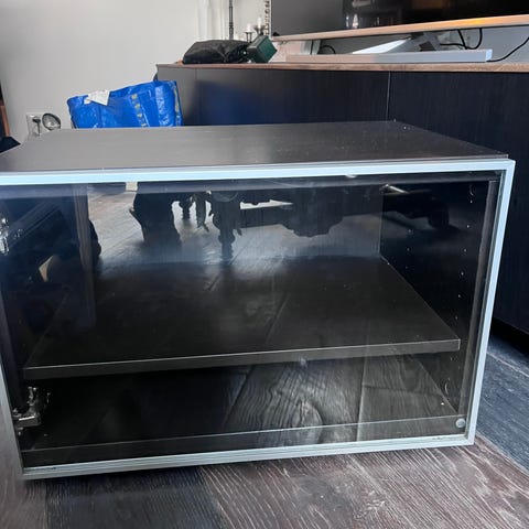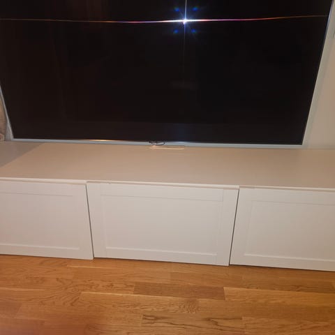 Två vita ”Bestå”-skåp (2+1) med vita dörrar. En hylla i varje del. Synligt använd med små repor ovanpå om man kollar noga. En kortsida har skruvhål, detta har inte varit synligt när man sätter ihop skåpen. En baksida saknas också då den tagits bort för att underlätta för sladdar.