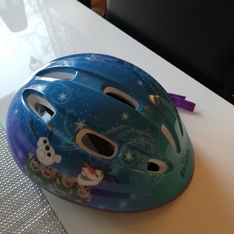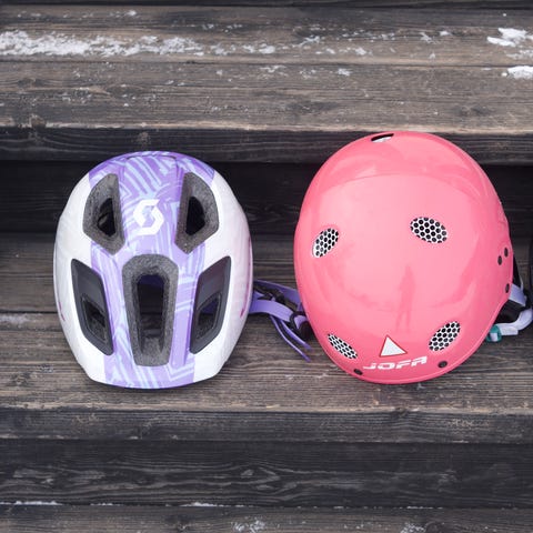 En cykelhjälm och en skridsko hjälm har även en rosa skridsko hjälm.