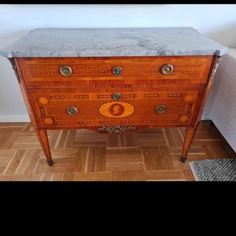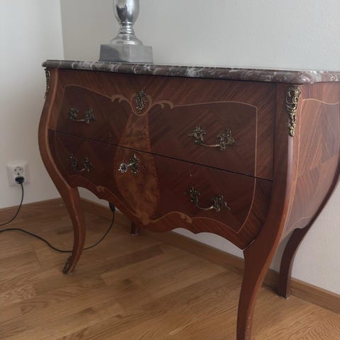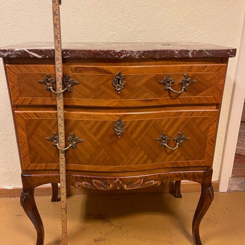 Fanérad i olika träslag. Lådor i fronten med intarsiadekor. Skiva i rödspräcklig marmor. Längd 111 cm, djup 48 cm, höjd 82 cm. Nyckel finns.