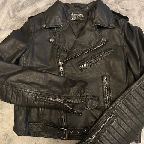 Klassisk biker-modell i svart med dragkedjor i metall. Lädret är mjukt och fint med normalt slitage, inga sprickor eller skador. Tidlös modell som passar både till vardag och mer uppklädda outfits.