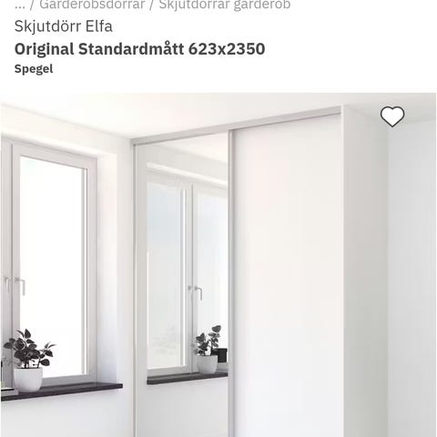Ett par skjutdörrar med skjutdörrlist. 85cm breda dörrar, 230cm höga. I bilden är de installerade i ett rum som är 170cm brett och 240cm högt. En dörr i vit färg med dekorativa speglar samt en dörr med hel spegelyta. Spotlights medföljer vid förfrågan.