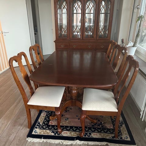 Matgrupp från Örnsköldsvik från början av 1900-talet. Matsalsbord höjd 75 cm, bredd 100 cm, längd 220 cm med sex stolar i brunt skinn. Sideboard höjd 93 cm, bredd 205 cm, djup 62 cm. Salsskåp med hyllor höjd 186 cm, bredd 151 cm, djup 56 cm. Delarna i gruppen säljs helst tillsammans. Pris för hela gruppen 4 000 kr. Pris för matbord med stolar 2 500 kr, salsskåp 1 500 kr, sideboard 1 000 kr.