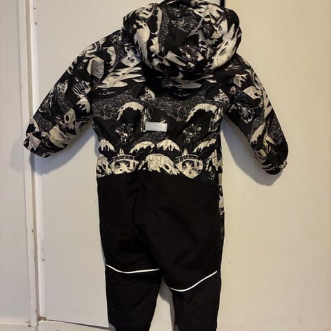 Overall har en avtagbar huva, lång dragkedja för enkel påklädning och slitstarka förstärkningar. Den har även en dragkedjeficka, reflexdetaljer och avtagbara och justerbara fothällor från Reima som är hela.