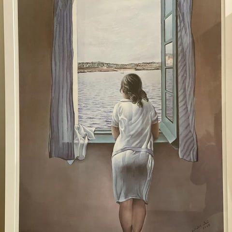 Tavla med motiv av en kvinna vid en sjö i gröna och ljusa toner. Bilden föreställer en person i lång kappa och hatt, sedd bakifrån, med landskap och vatten i bakgrunden. Tavlan är inramad med passepartout och glas. Passar som väggdekoration i exempelvis vardagsrum, sovrum eller hall.