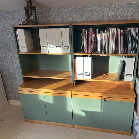 Tre skåp och tre lådor. Höjd 86 cm, bredd 150 cm, djup 44 cm.