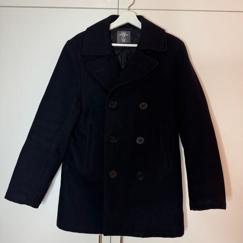 Superdry rock för herr i storlek S. Rocken är grå och tillverkad i ullmaterial. Modellen har dubbelknäppning framtill, krage och två framfickor. Baksidan har en dekorativ slejf i midjan. Passar som ytterplagg under kallare säsonger.