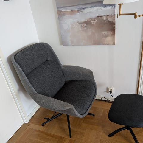 IKEA fåtölj i grått tyg. Modellen är formgiven av Aage Petersen. Fåtöljen har bred sittyta med separat fotdel/chaise-liknande del och lösa rygg- och prydnadskuddar. Klädseln är avtagbar på kuddarna enligt bild, vilket underlättar rengöring. Passar som sitt- och vilomöbel i vardagsrum eller sovrum.