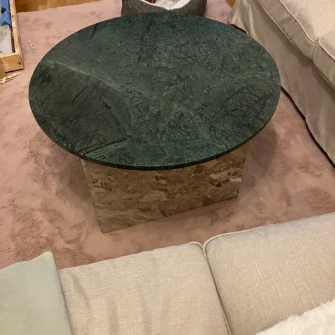 Säljer ett mycket fint och tidlöst bord som passar perfekt som antingen soffbord i en mindre grupp eller som ett elegant sidobord. Bordet har en massiv skiva i vitmelerad marmor med en vacker, levande mönstring.