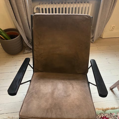 En fin fåtölj med puff i modell Ro av Fritz Hansen i färg "Sand". Har använts i ett rök/djur/barn-fritt hem. Visst slitage finns, se bilder. Det är framför allt en liten reva på armen samt ett mörknat parti på nackstödet. Jag gissar att det senare går att fixa med textiltvätt. Annars är fåtöljen och pallen i jättefint skick.