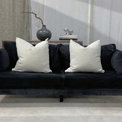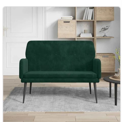 Fin soffa i grön sammetsklädsel. Soffan har två sittdynor och flera lösa ryggkuddar i samma tyg. Benen är smala och mörka, vilket ger ett lätt intryck. Passar som sittmöbel i vardagsrum eller liknande utrymme. Exakta mått och modellbeteckning är inte angivna.