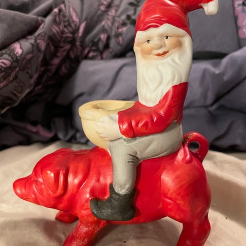 Tomtar små figurer i flerfärgad design. Setet består av tre tomtar i sittande och liggande positioner med blå och gul mössa, gröna och gula kläder samt svarta skor. Höjden är cirka 6 cm enligt måttband på bild. Passar som dekoration inomhus, till exempel i hylla, på bord eller som del i jularrangemang och miniatyrmiljöer.