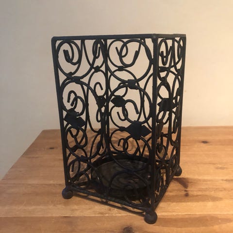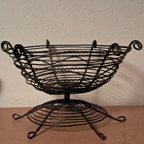 dekorationsskål i svart metall. Skålen är formad av tunna metalltrådar med dekorativa detaljer runt kanten och foten. Höjden är cirka 16–17 cm och diametern cirka 20 cm enligt måttbandet på bilderna. Passar som dekoration eller för förvaring av lättare föremål som till exempel frukt eller mindre prydnader.