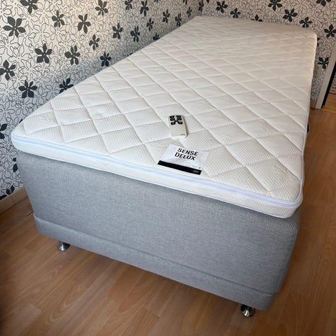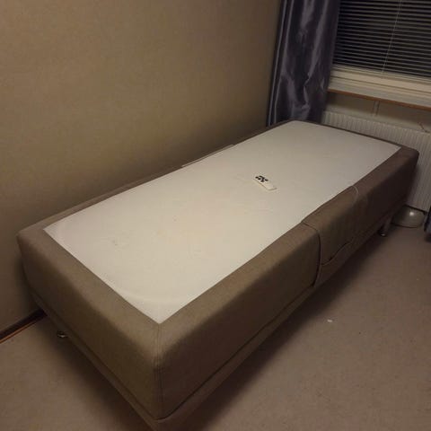 Fullt fungerande ställbar säng som tyvärr slagit sig/ vridit sig på något vis. Viss snedlutning i huvudändan, men kände det inte när madrassen låg på samt att kroppstyngden tryckte ner.