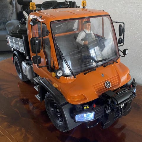 Radiostyrd terrängbil i jeepmodell med fyrhjulsdrift. Bilen har grovmönstrade däck och stötdämpare anpassade för körning i terräng. Karossen är i hårdplast med detaljer som reservdunkar bak. Elektronik och mottagare sitter monterade på chassit. Lämplig för hobbybruk och körning utomhus på varierande underlag.