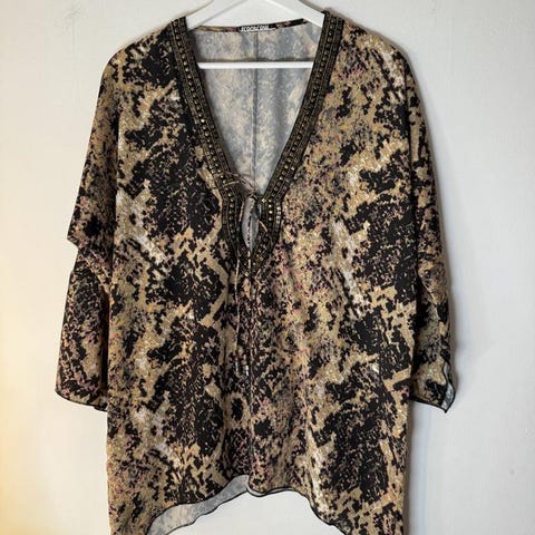 Vit blus från Saints & Mortals med ett mönster av svarta prickar. Blusen har en v-ringning och 3/4 ärmar. Den har även ett dekorativt band med paisleymönster och prickar.