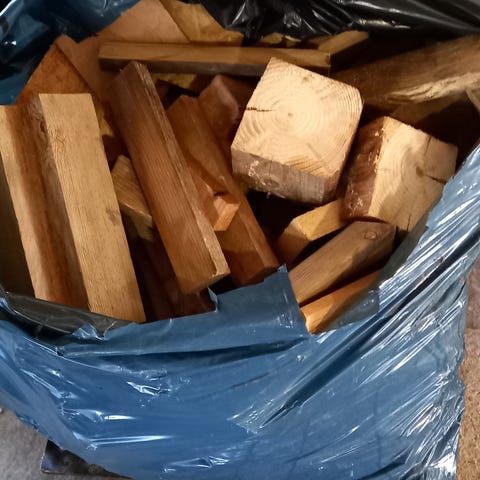 7-8 säckar med vårt rivna parkettgolv, c:a 16 kvm. Golvet var lagt flytande och spikat så alla delar går inte att återanvända. Passar för mindre snickeriprojekt, hobbybruk, kilar eller som bränsle där det är tillåtet.