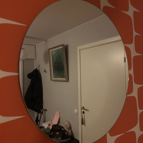 2 Mio rund spegel med kedje- och remupphängning i metall samt i läder. Speglarna har ram i metall i olika färger och hängs upp med kedja respektive rem fäst i väggbeslag. Passar exempelvis i hall, sovrum eller vardagsrum som väggspegel eller dekoration.