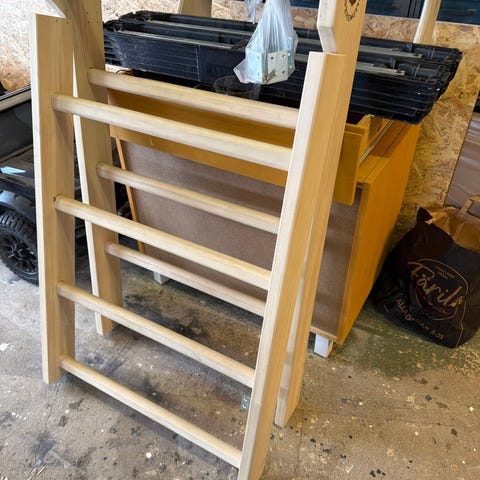 Ribbstol i trä med flera ribbor monterad mot vägg. Passar för enklare hemmaträning, stretching och rörelseövningar. Neutralt utförande som fungerar i de flesta rum 2 delad.