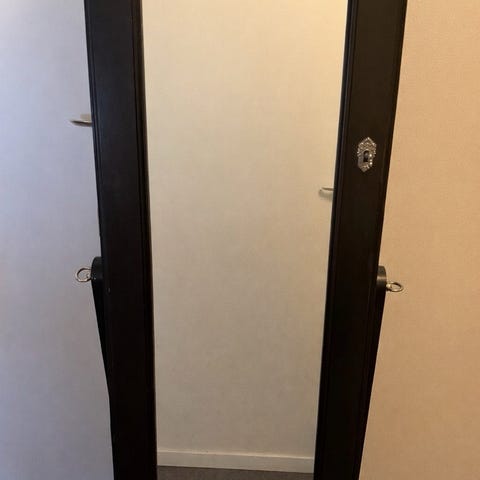 Spegel med förvaring i svart utförande (20x80). Spegeln är avlång och öppnas som ett skåp med flera krokar och upphängningsmöjligheter på insidan, lämplig för förvaring av till exempel smycken, nycklar eller andra mindre accessoarer. Passar att hängas på vägg i hall, sovrum eller klädkammare.