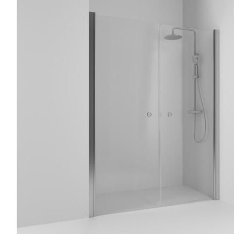 Duschväggen är tillverkad i glas med metallprofiler. Levereras med handtag, skruvsatser, monteringsanvisning och profiler enligt etiketten på förpackningen. En skada syns på ett av glasens hörn, se bild för detaljer. Skadan döljs av magnetlisten.