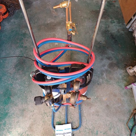 Gassvetsutrustning med friköpta 5 liters tuber och ett antal munstycken + slang och kärra