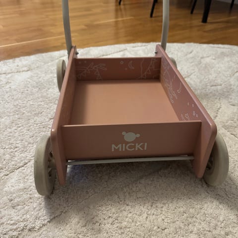 Mickis klassiska Lära-gå-vagn i trä helt ny i obruten förpackning. Säljes pga att vi fick 2 likadana i 1-års present.