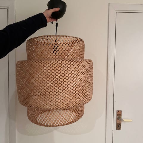 Taklampa i möjligtvis bambu material, som ger fint sken. Mycket bra skick!