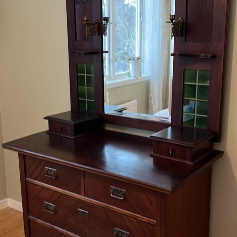 Spegelglaset har lite åldersfläckar och det finns en mindre faner på vänstra skåpet, och bordsytan lite ålders/vintage-skick m små märken.