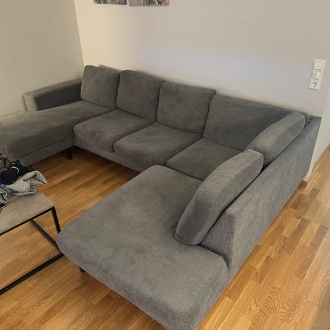 Soffan har en L-form med schäslong och lösa ryggkuddar. Klädseln är i vävt tyg och visar spår av slitage, särskilt på vissa hörn och kanter - vår katt har dessvärre rivit tyget. Ps har ingen aning om designer, men det går inte välja - vet ej - i Blockets tjänst. Ds