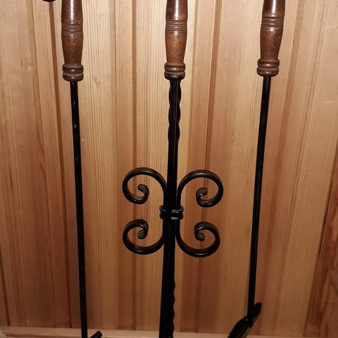 Eldstadsset i mässing med ställ. Setet består av ställning, spade, tång, borste och eldgaffel. Passar för användning vid öppen spis eller kamin för hantering av ved, aska och rengöring runt eldstaden. Klassisk design i metall med mässingsfinish.